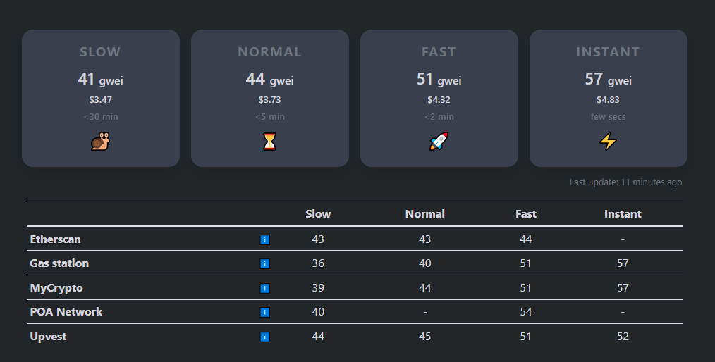 - Etherscan Gas Tracker: uma boa ferramenta fornecida pela Etherscan. Atualiza os preços do gás a cada 14 segundos.