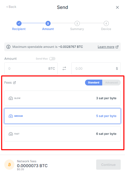 Você pode escolher o valor das taxas de rede a serem incluídas ao criar uma transação em sua Ledger Nano S ou Ledger Nano X. O valor das taxas afeta a velocidade de processamento da transação.