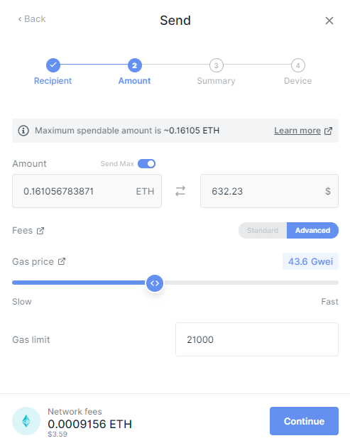 O preço do gás é medido em Gwei, que é a menor unidade de Ethereum (ETH). 1 gwei é igual a 0,000000001 ETH. Ou seja, 1 ETH representa 1 bilhão de gwei. Então o limite de gás é a quantidade total de trabalho que você está solicitando dos mineradores para que sua transação seja processada e transmitida pela rede. Normalmente, esse valor é predefinido para você no Ledger Live e equivale a 21.000 Gás por padrão para a maioria das transações.