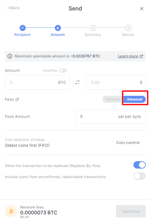 Você pode alternar entre as interfaces de taxas padrão e de taxas avançadas no Ledger Live: