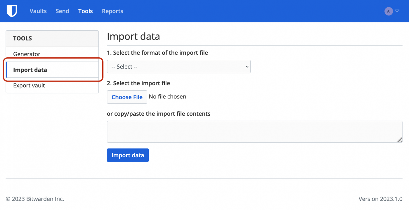 - Em seguida, clique em Import data para importar suas credenciais de login: