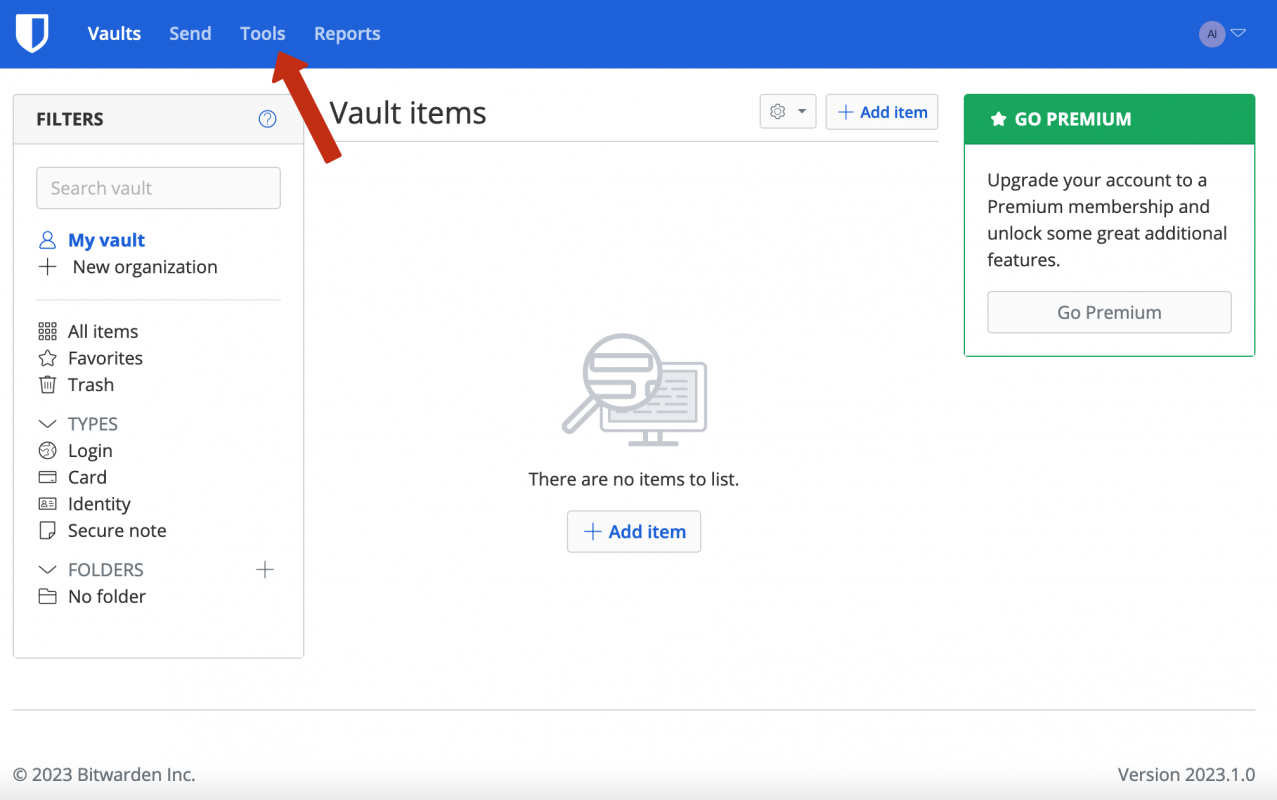 - Faça login no cofre da web Bitwarden em https://vault.bitwarden.com