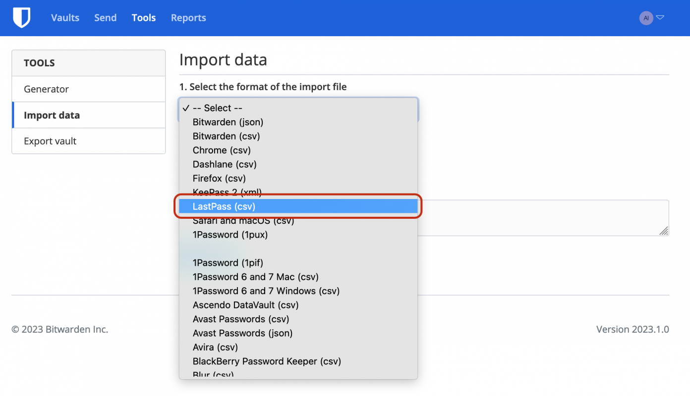 - Usando o menu suspenso, selecione LastPass (csv) como o formato de arquivo (o formato de arquivo Trezor Password Manager espelha o do LastPass):