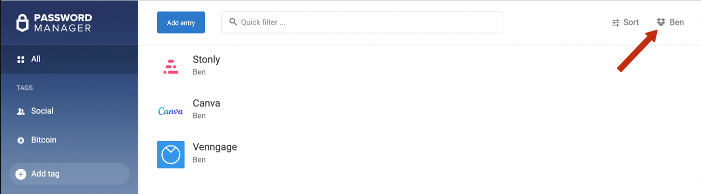 - Clique no seu nome de usuário no canto superior direito da interface do Trezor Password Manager: