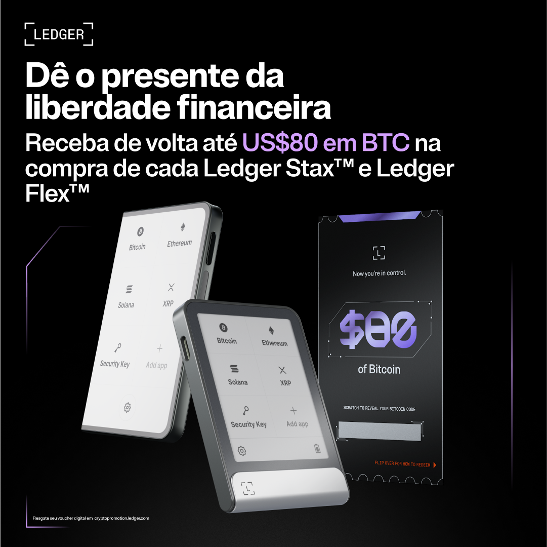 *Para resgatar sua recompensa, siga os passos em: https://www.ledger.com/pt-br/como-resgatar A compra deve ser feita entre 20 de novembro e 21 de dezembro de 2025.Entre no mundo dos ativos digitais com a segurança que você vê, sente e toca. O Ledger Flex™ foi feito para o uso diário de suas criptomoedas e NFTs, oferecendo leitura clara e assinatura de transações com facilidade na tela sensível ao toque E Ink®.