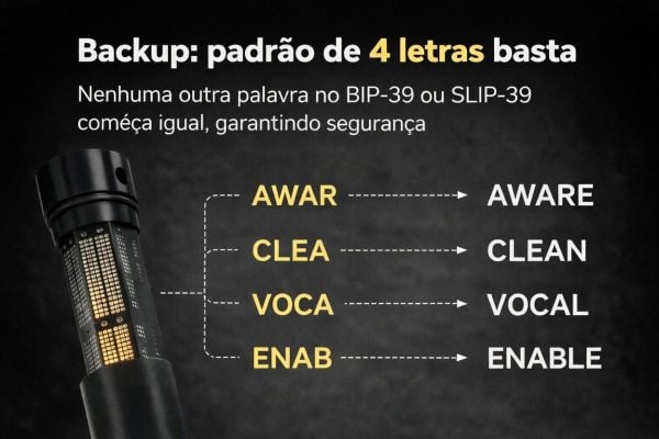 Isso funciona porque, no padrão de palavras utilizado pela Trezor, Ledger e SecuX (BIP-39 ou SLIP-39), as primeiras 4 letras já identificam a palavra de forma única.