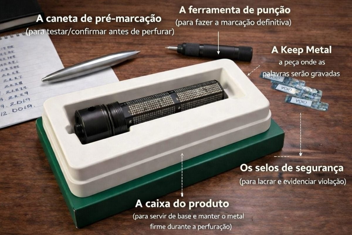 Se você nunca teve um backup em aço, pense assim: você vai “copiar” suas 24 palavras para o metal, marcando letras de um jeito guiado e à prova de erro. Abaixo está o passo a passo do zero, sem assumir conhecimento prévio.